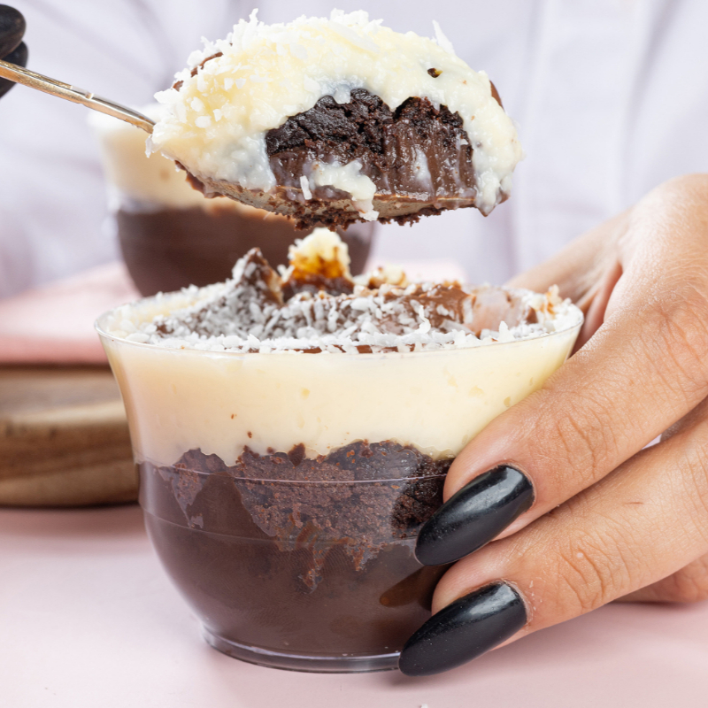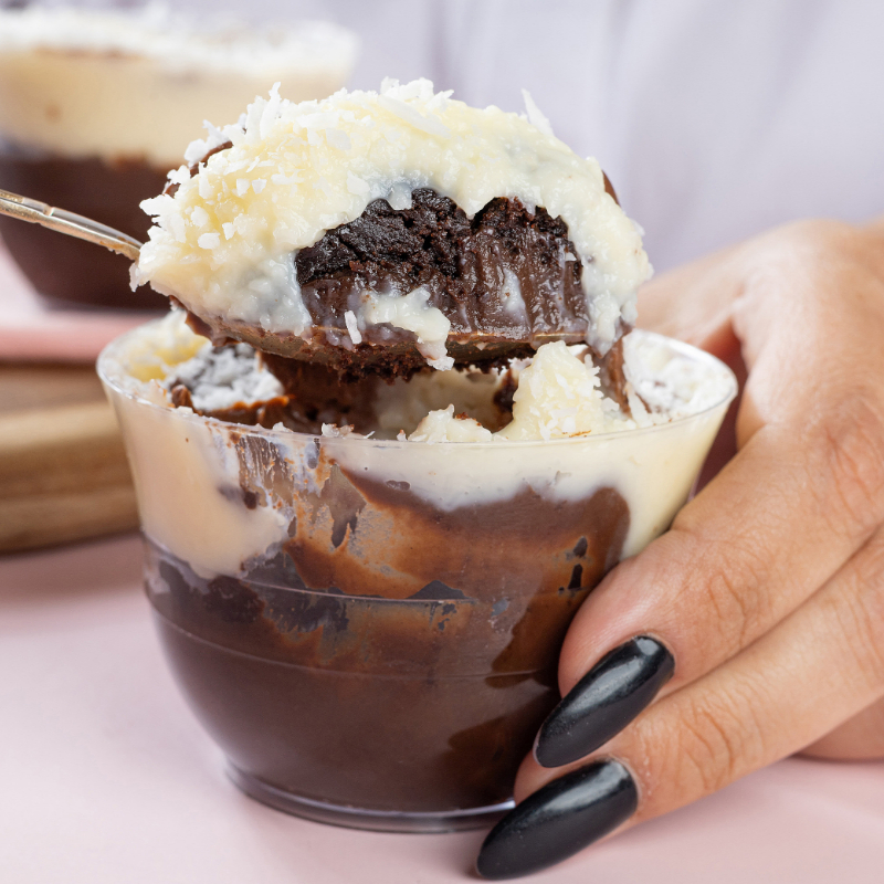 Deliciosas camadas de brigadeiro trufado, pedaços do nosso queridinho brownie, brigadeiro cremoso de coco (o famoso beijinho) e ganache de chocolate nobre ao leite, finalizado com coco ralado. 190g