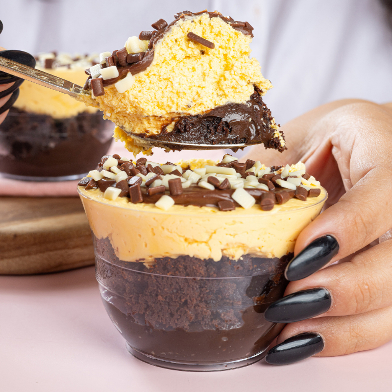 Deliciosas camadas de brigadeiro trufado meio amargo, pedaços de brownie chocolatudo, mousse trufado de maracujá feito à base de chocolate nobre branco, finalizado com ganache de chocolate ao leite e granulado de chocolate nobre branco e ao leite. 190g