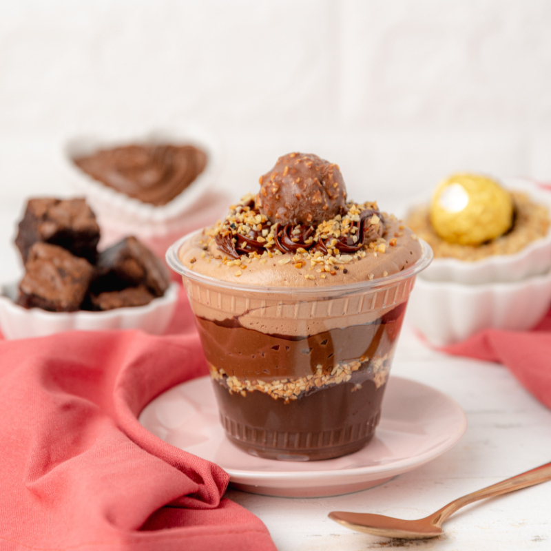 Deliciosas camadas de Brigadeiro Trufado feito com chocolate nobre meio amargo, pedaços do nosso famoso brownie chocolatudo, Nutella, Xerem de castanha de Caju, mousse de Nutella e finalizado com um bombom Ferrero Rocher. 290g