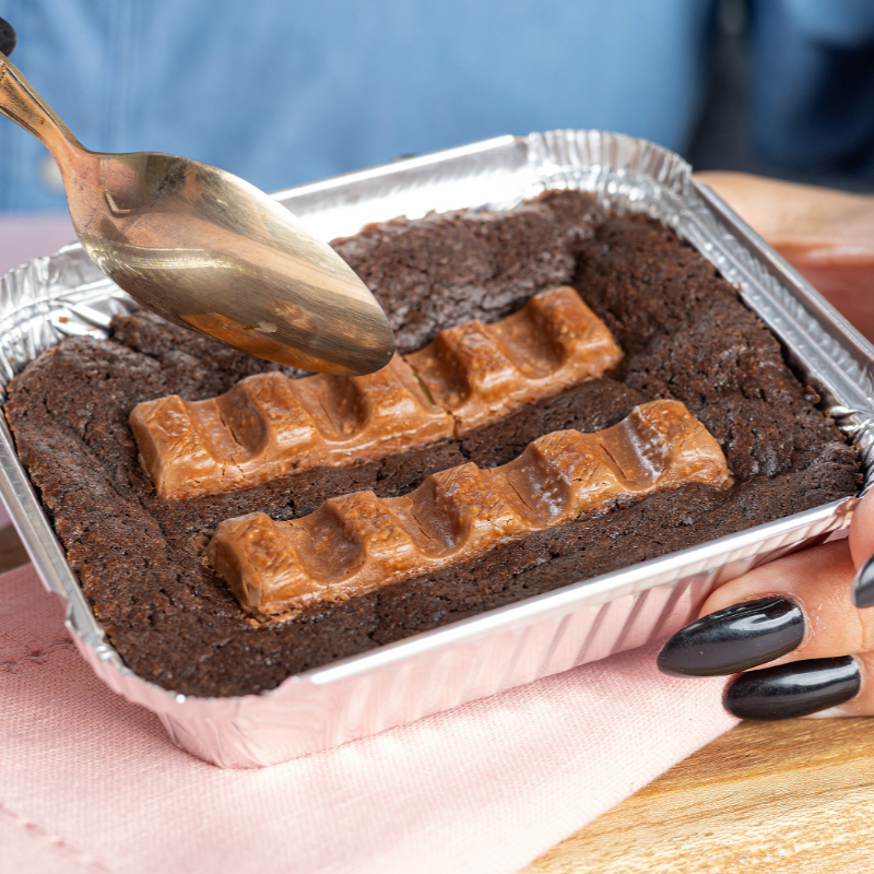 Brownie feito com chocolate nobre meio amargo, casquinha crocante por fora e cremoso por dentro e pra melhorar, por cima temos o chocolate Kinder. 150g