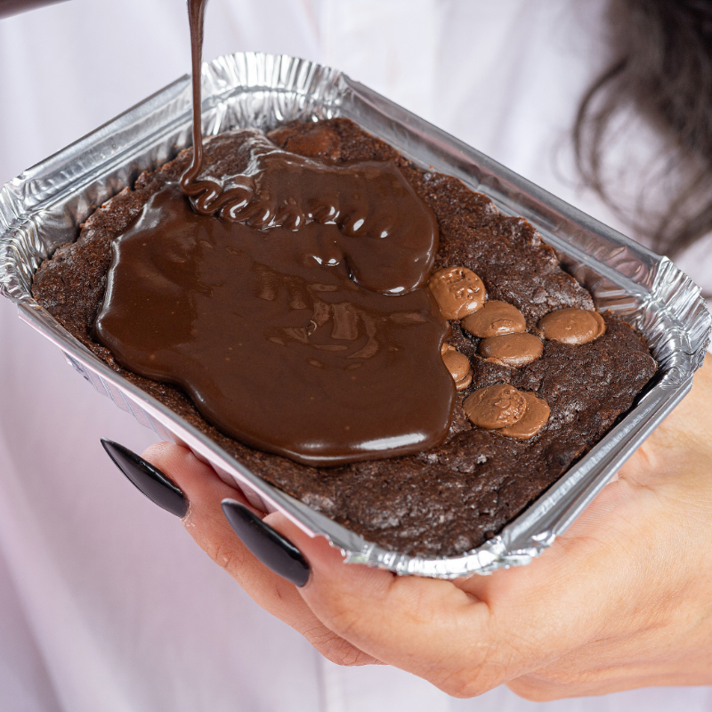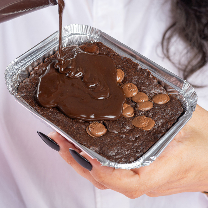Brownie super chocolatudo, feito à base de chocolate nobre meio amargo, coberto com a cobertura que mais combina com você.