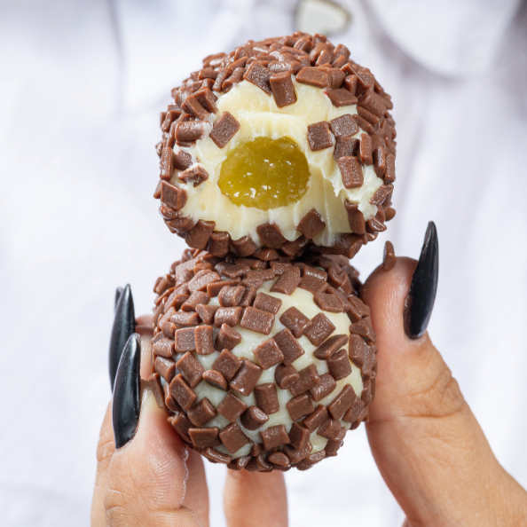 Brigadeiro branco gourmet super cremoso, recheado com uvas verdes fresquinhas sem caroço e finalizado com granulado de chocolate nobre ao leite. 80g