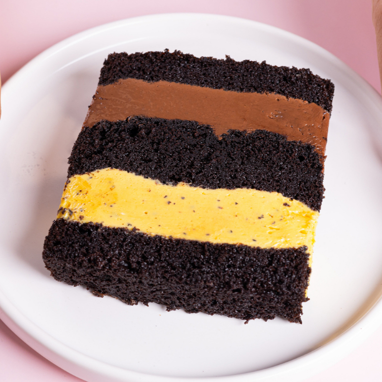 Fatia de bolo de cacau black, super molhadinha, recheada com ganache de maracujá artesanal e ganache cremosa de chocolate nobre ao leite e meio amargo. 250g