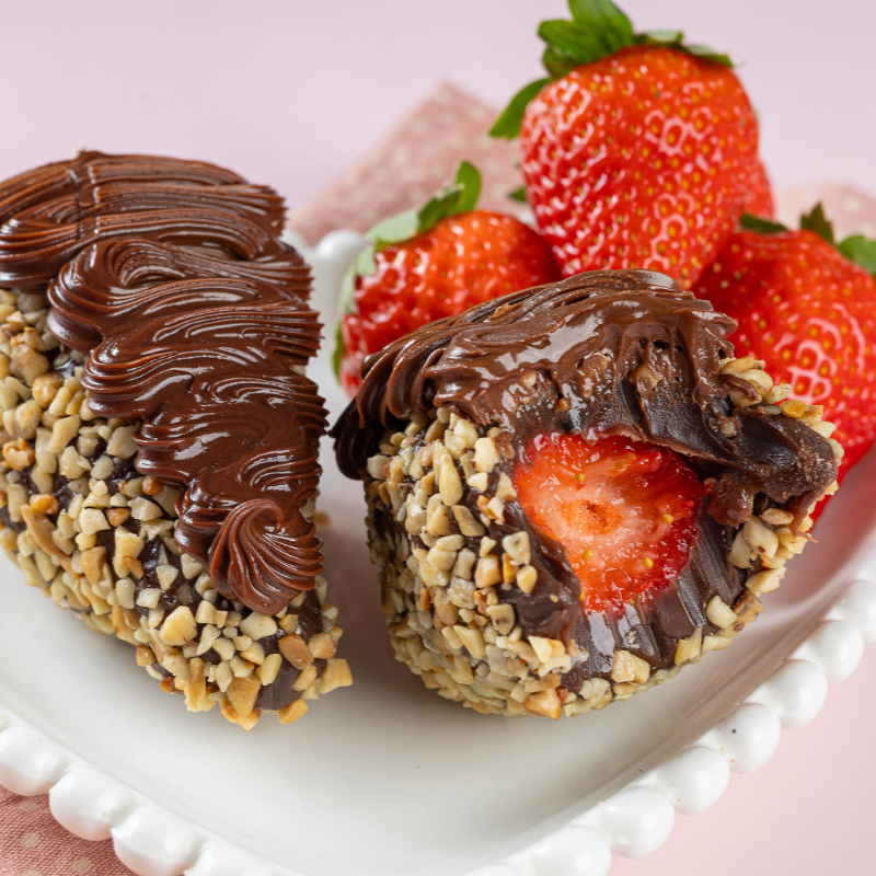 Morango selecionado, coberto com brigadeiro gourmet tradicional cremoso e finalizado com xerém de castanha de caju e Nutella pura.