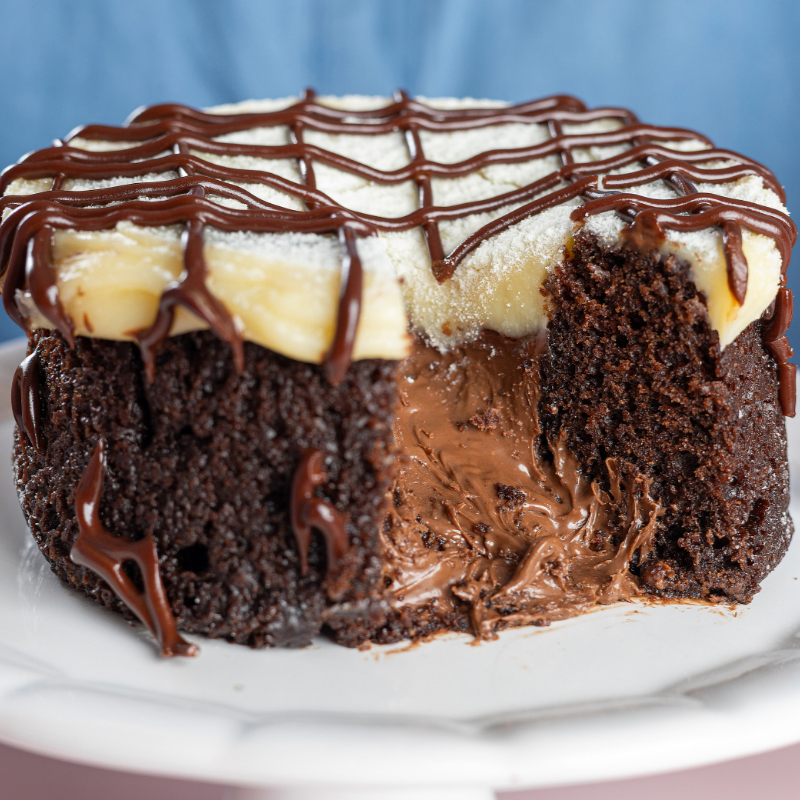 Bolo de chocolate fofinho, super chocolatudo, com cobertura de brigadeiro cremoso de Leite Ninho, recheio vulcão de Nutella pura e finalização com fios de Nutella e Leite Ninho em pó. 350g