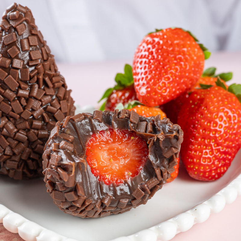 Morango selecionado, coberto com brigadeiro gourmet ao leite cremoso e finalizado com granulado de chocolate nobre.