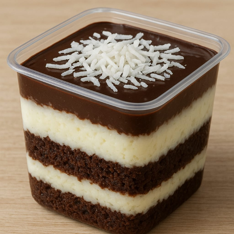 Delicioso bolo de pote de prestigio com massa de chocolate, brigadeiro e beijnho finalizado com coco ralado em cima.