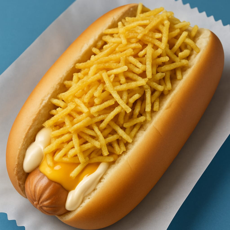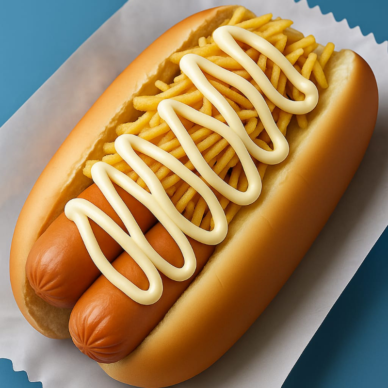 Delicioso Hot Dog completo com 2 Salsichas, Purê, Vinagrete, Milho, Catupiry, Maionese e Batata Palha