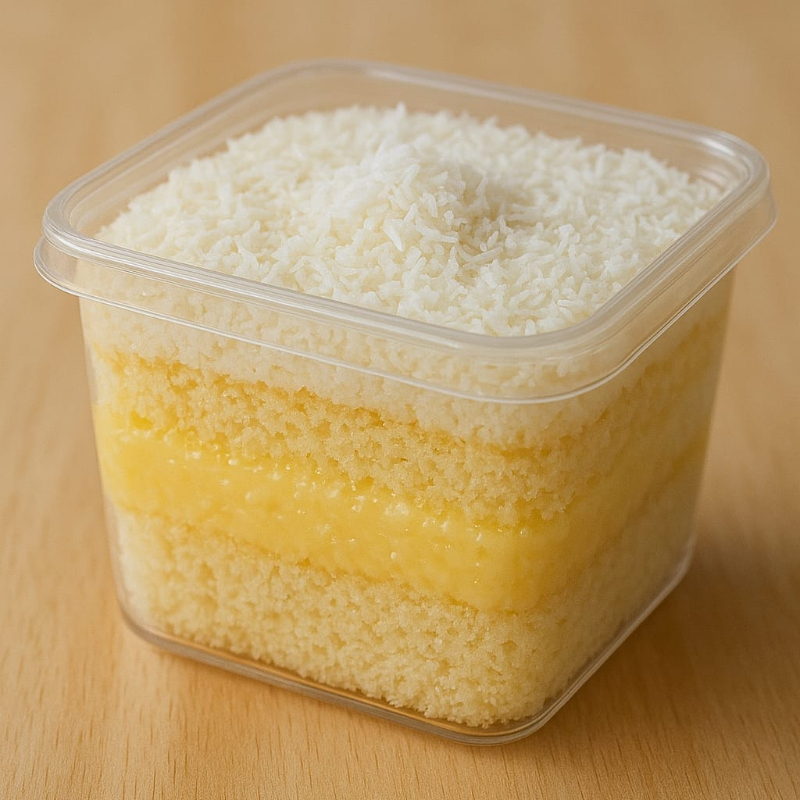 Delicioso bol de pote com massa branca recheado de doce de leite com coco, finalizado com coco ralado em cima.