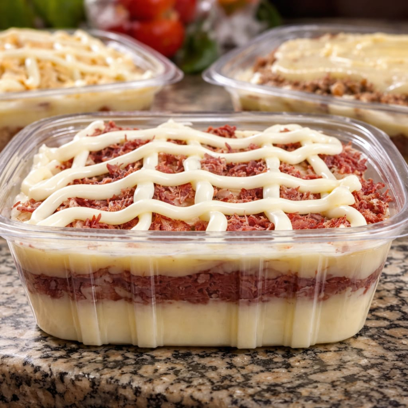 Escondidinho de carne seca desfiada, cuidadosamente dessalgada e refogada até ficar macia e cheia de sabor. Preparado em camadas com purê cremoso e finalizado com uma generosa camada de Catupiry, que traz cremosidade e suaviza o sabor marcante da carne. Um prato tradicional, rico e irresistível, perfeito para quem aprecia combinações clássicas e reconfortantes.