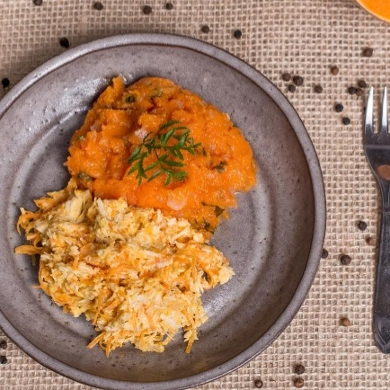Frango Desfiado, Arroz Branco, Purê De Abóbora E Couve Refogada 300g