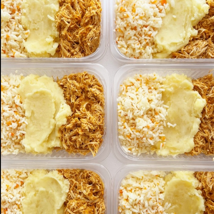 Frango Desfiado, Arroz, Purê De Batata Inglesa E Couve Refogada 300g.