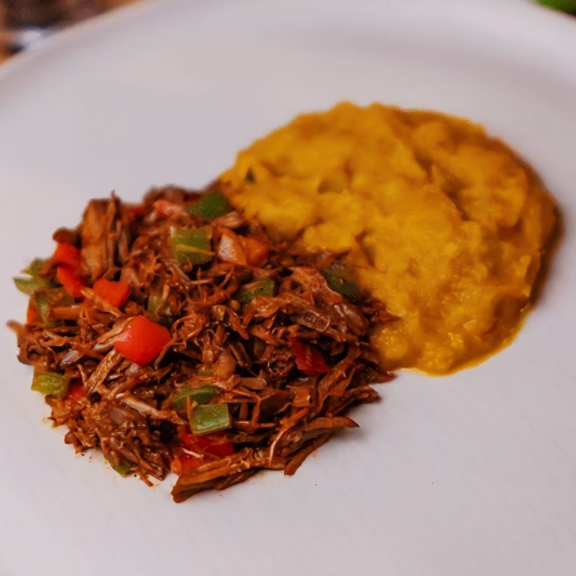 Carne Louca, Arroz, Purê De Abóbora E Couve Refogada 300g.