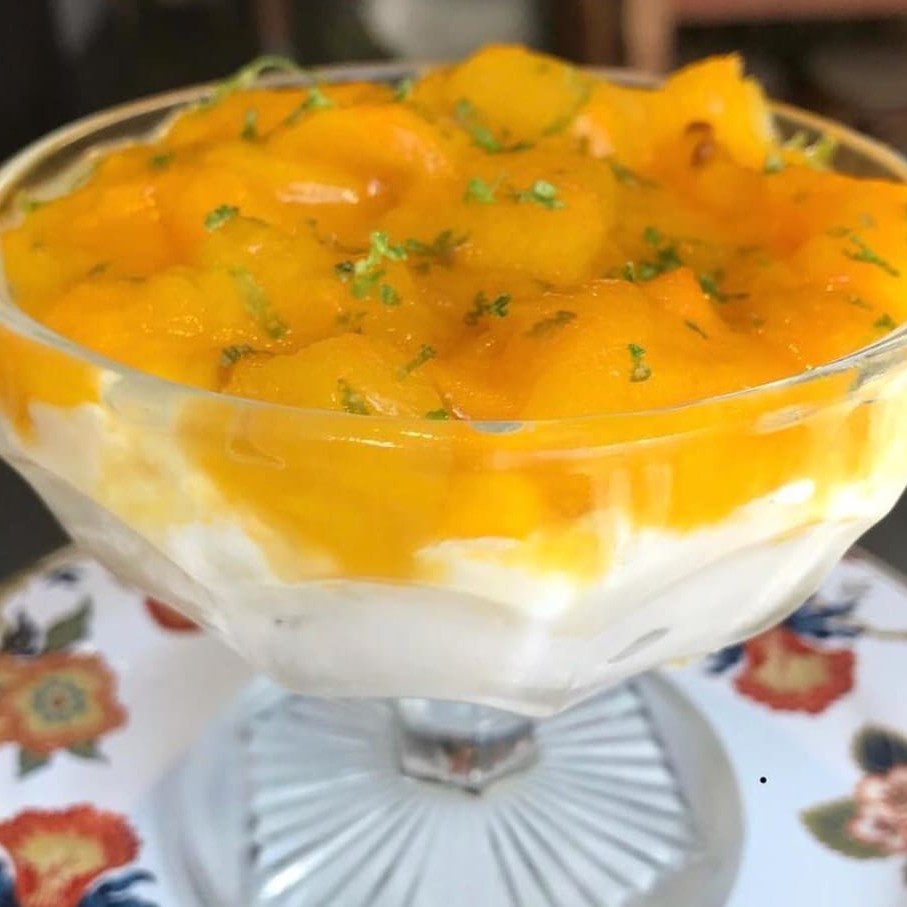 Leite de coco, coco ralado, manga, cardamomo, raspas de limão e adoçante. Sem glúten,sem lactose e sem açúcar.