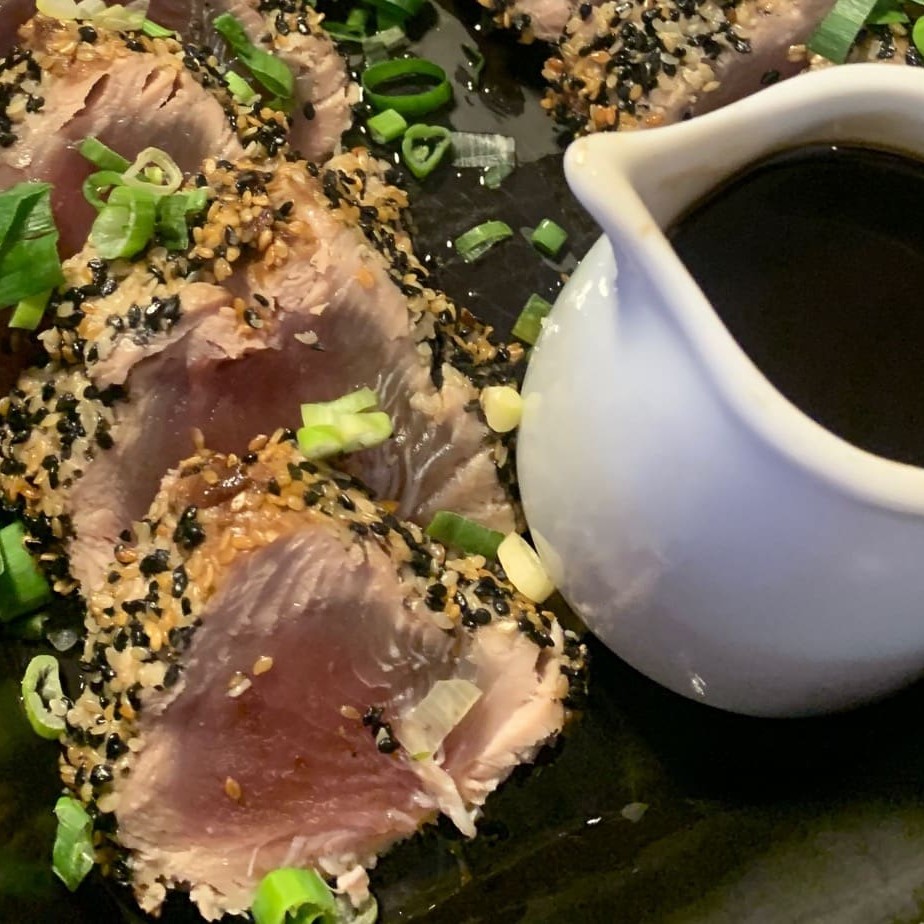 Lombo de atum selado em óleo de gergelim com crosta de sementes de gergelim branco e gergelim preto (centro do atum cru ou levemente rosado). Acompanha molho tarê artesanal.
