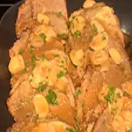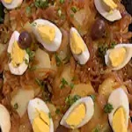 Assado com batatas, cebola caramelizada, azeitonas e ovos cozidos. Sem glúten. Sem lactose. Com ovos.