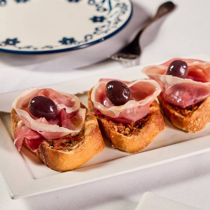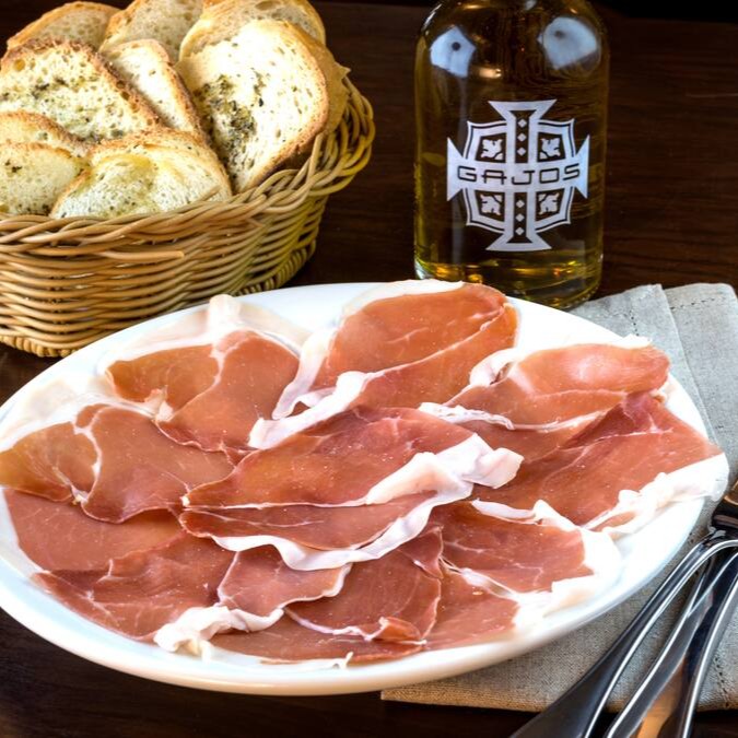 Jamón Serrano fatiado, com pão tostado na grelha e tomate concase.