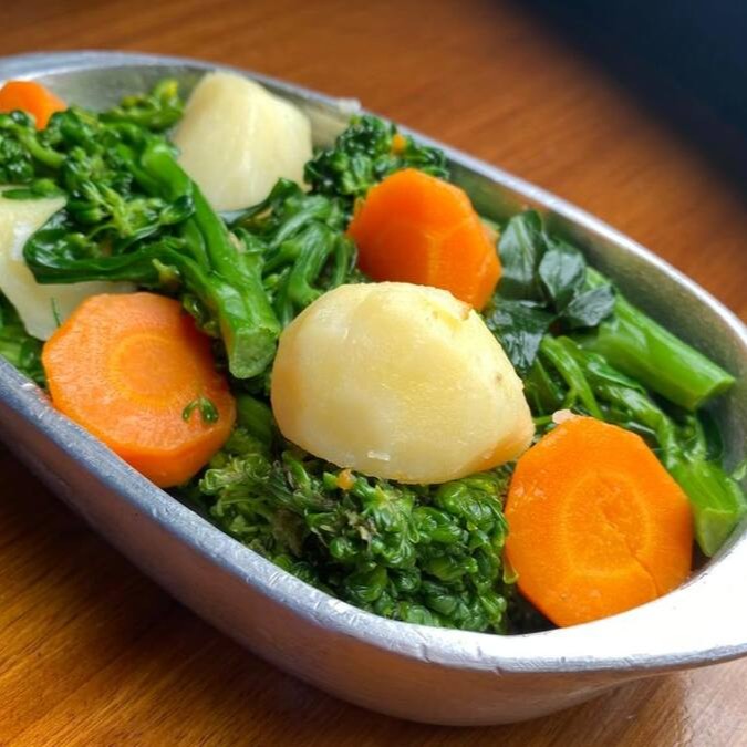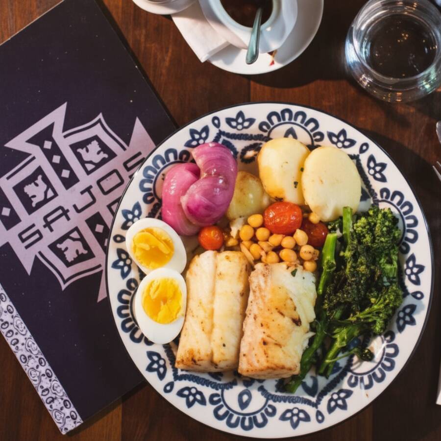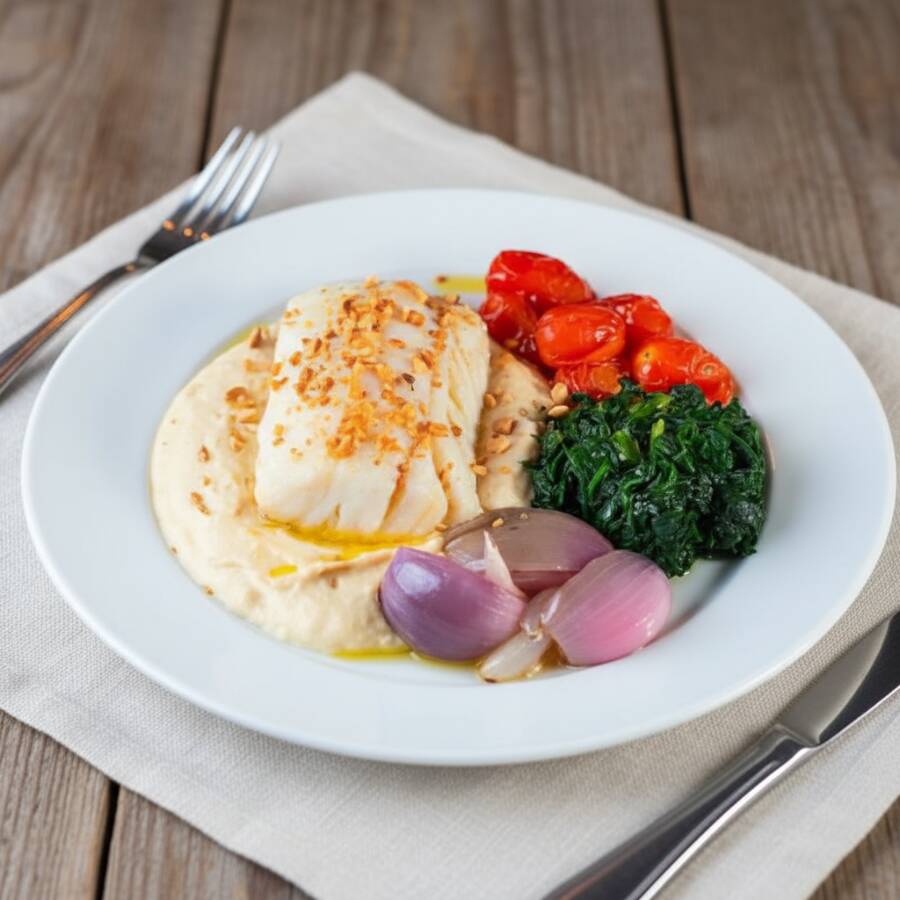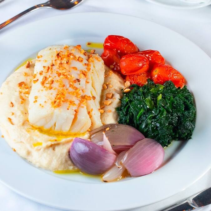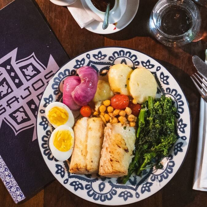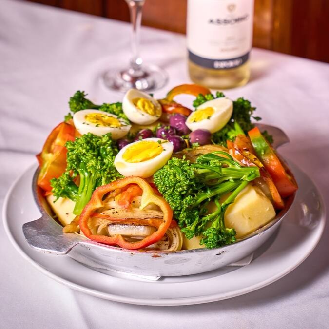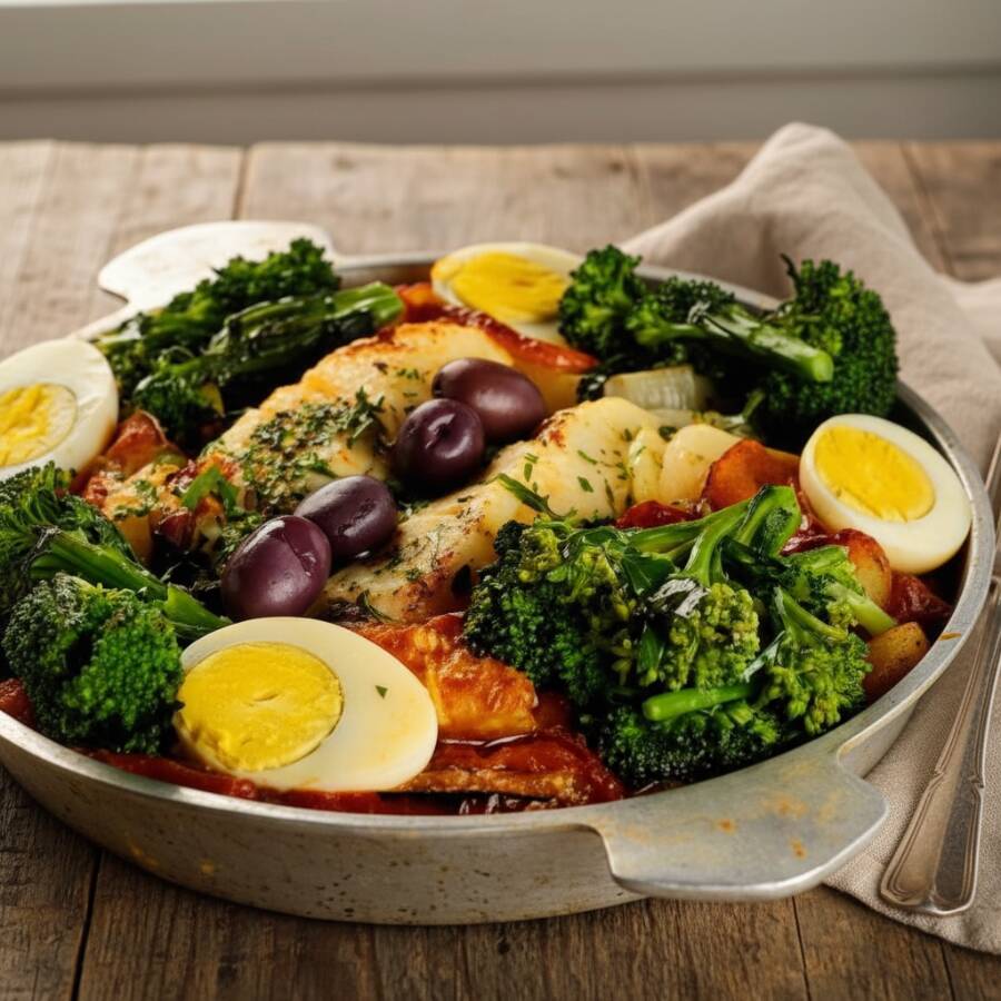 Lombo de bacalhau cozido, batatas, grão de bico, ovos, cebola roxa e brócolis.