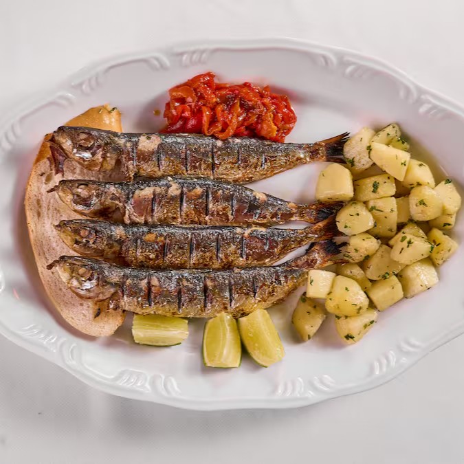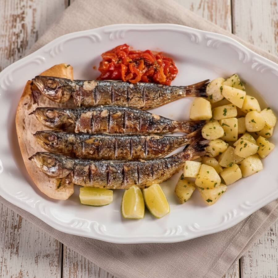 Sardinha portuguesa assada e acompanhada de batatas cozidas e pimentões