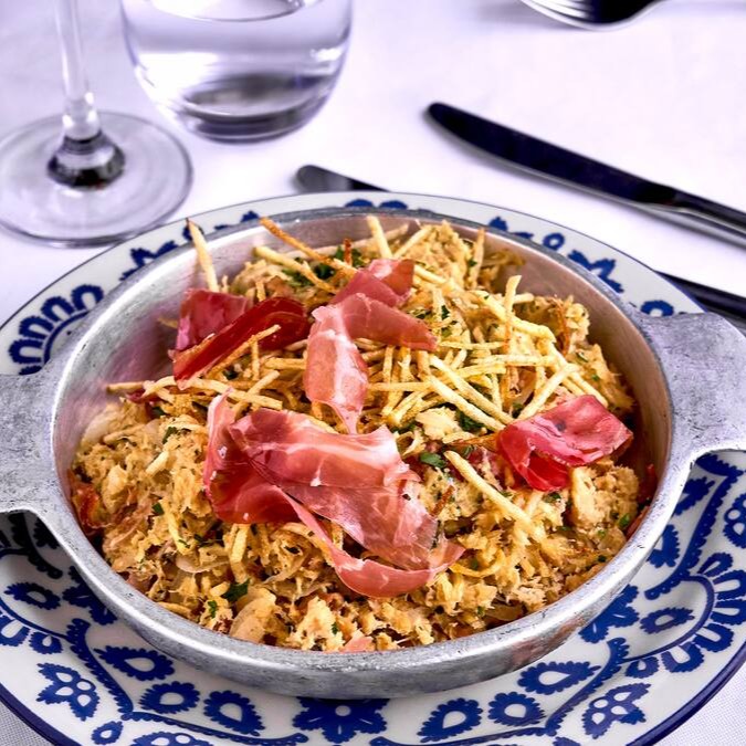 Bacalhau desfiado, azeite, ovos, batata palha, jamon serrano.
