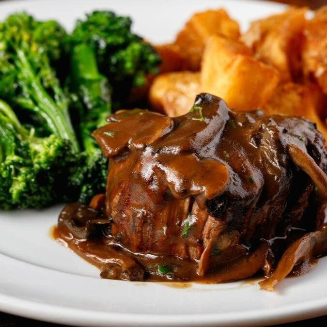Medalhão de mignon grelhado ao molho madeira com cogumelos. Acompanha batatas rústicas e brócolis.