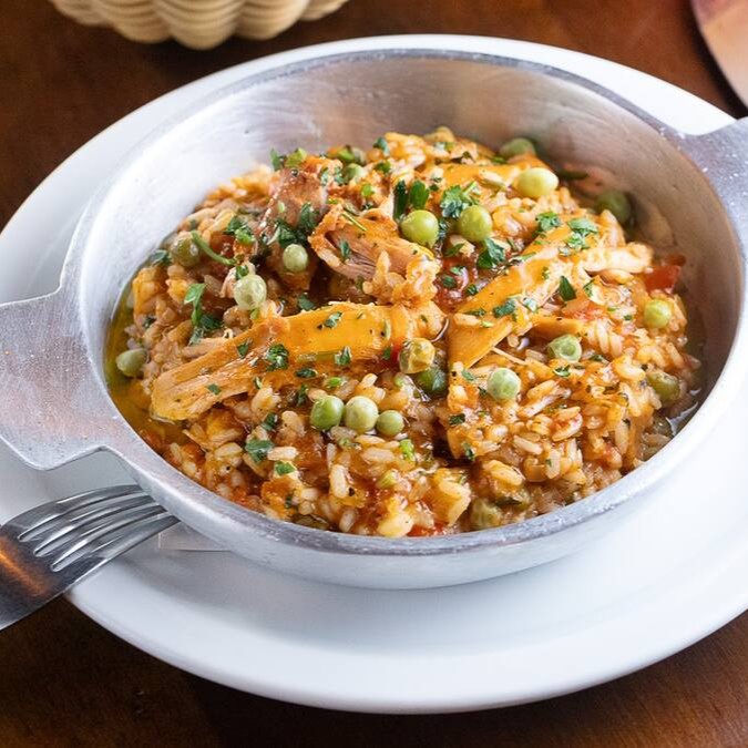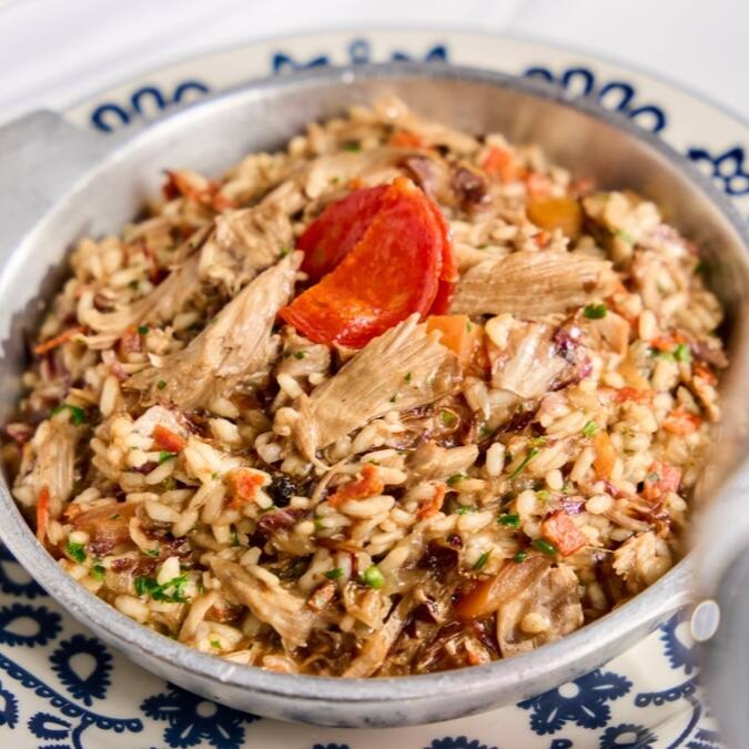 Arroz arbóreo cozido com pato desfiado, manteiga, tomate, cebola, chorizo espanhol e radicchio