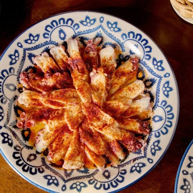 Fatias de polvo cozido, azeite, páprica doce e flor de sal. Acompanhado de torradas