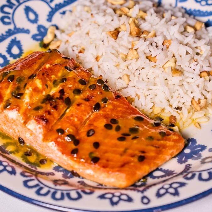 Filé de salmão na brasa, molho de maracujá e arroz de castanha de cajú.