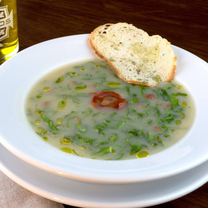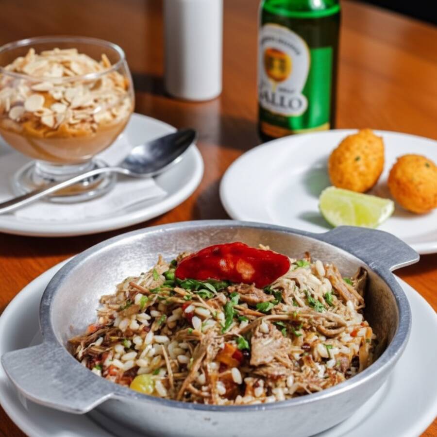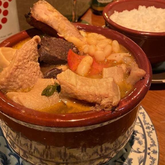 Dobradinha, carnes suínas e bovinas, paio, cenoura, feijão branco, morcilla e toque do cheff.