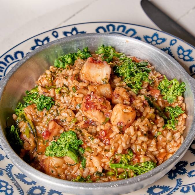 Arroz arbóreo cozido com polvo em pedaços, manteiga, salsa, tomate e brócolis