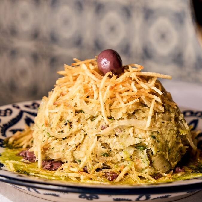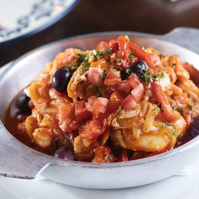 Bacalhau À moda d’Andorinha, lascas de bacalahu, batatas, cebola, pimentão, tomates, ovos e azeitonas.