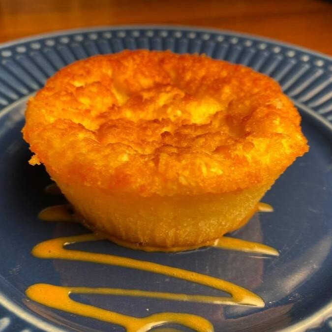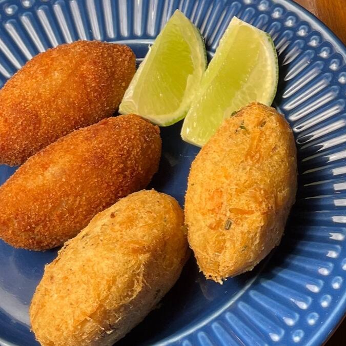 Bacalhau desfiado, leite, ovo, cebola. Acompanha batatas fritas portuguesas