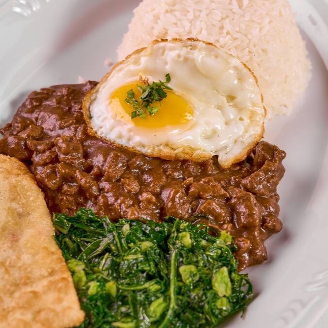 Iscas de filé mignon ao molho roti. Acompanha arroz, feijão, ovo frito, couve e pastel de queijo