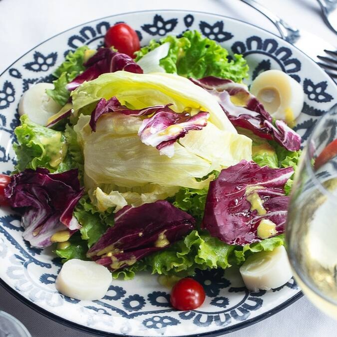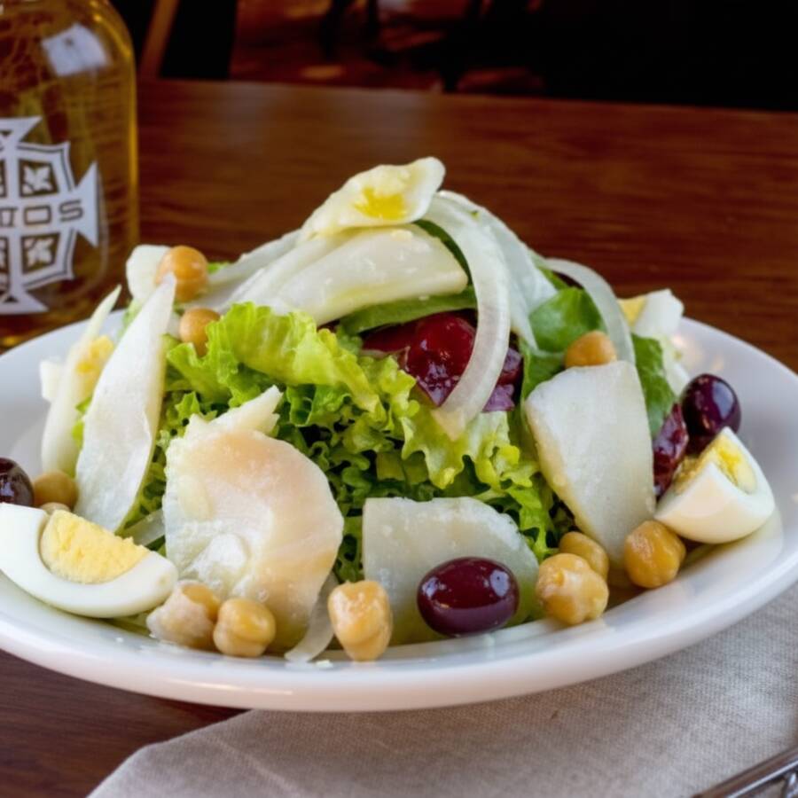 Bacalhau em lascas, cebola, feijão, azeitonas pretas, tomate, mix de folhas, grão de bico, ovo cozido e azeite