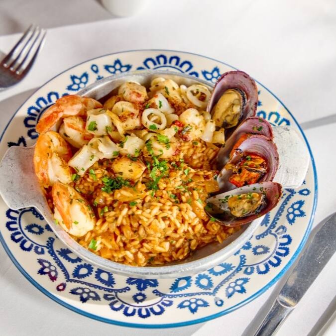 Lulas, polvo, camarão temperados com cebola, limão e azeite. Acompanha batata bolinha assada