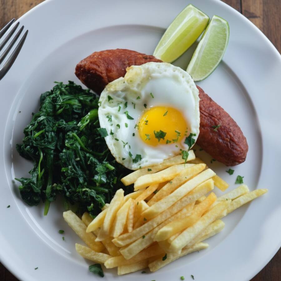 Linguiça portuguesa acompanhada de ovo frito, batatas fritas e espinafre
