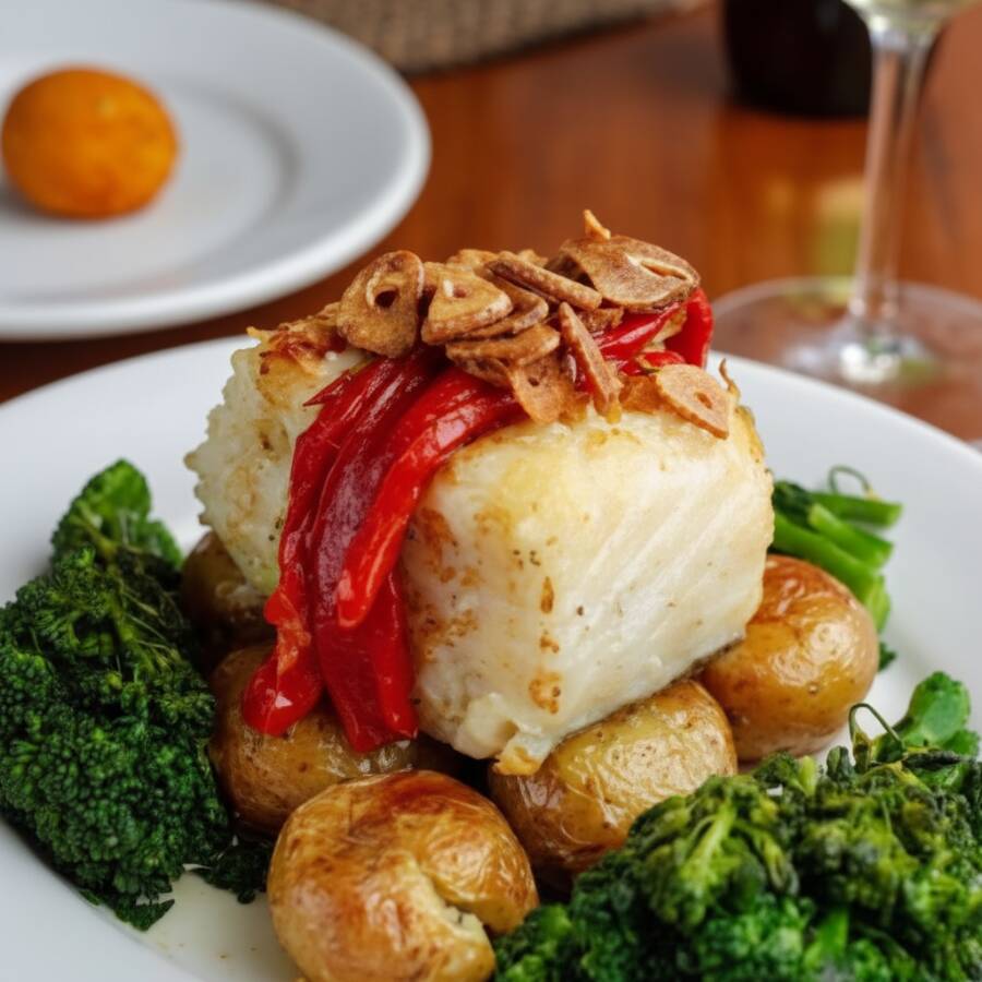 Bacalhau em posta com batatas ao murro, brócolis, azeite, alho e pimentão.