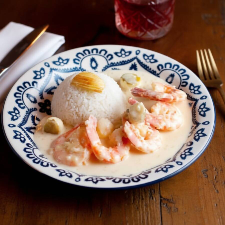 Camarões na manteiga com cebola, espumante no preparo, creme de leite, noisettes de maçã e arroz.