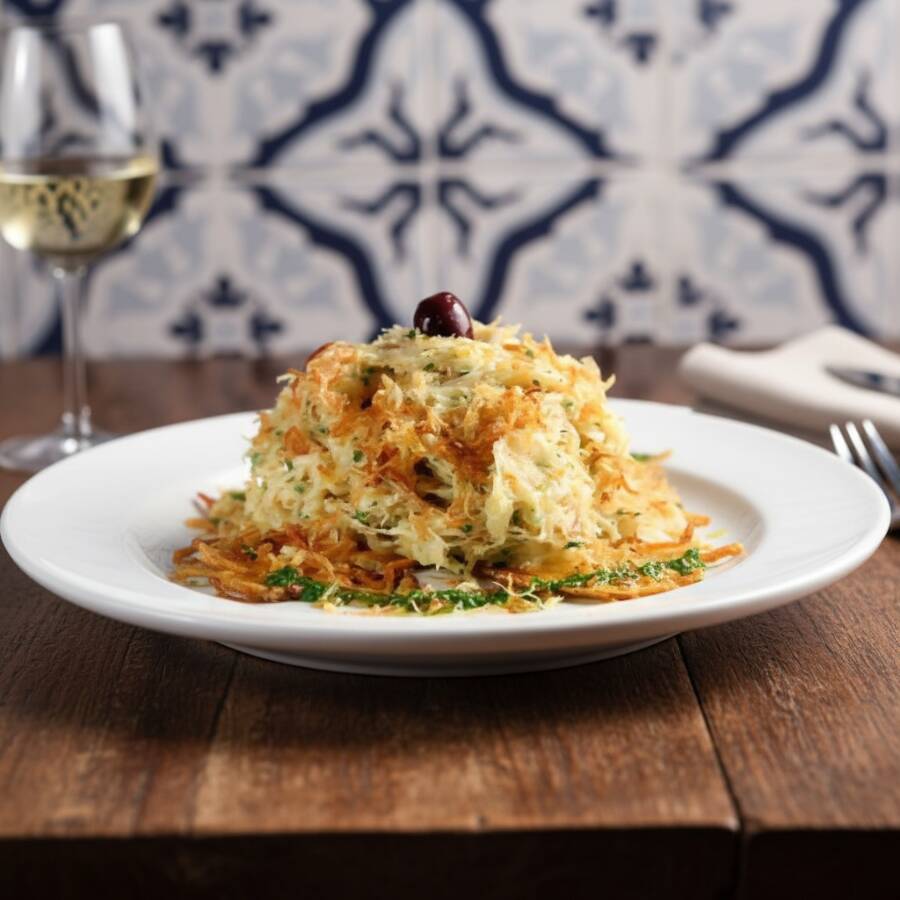 Bacalhau desfiado ao molho bechamel, cebola, batata, salsinha e parmesão