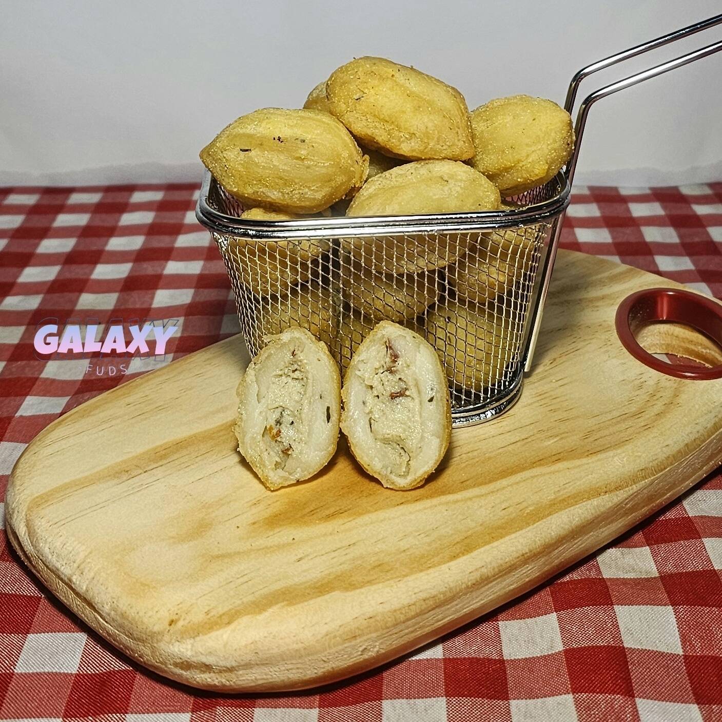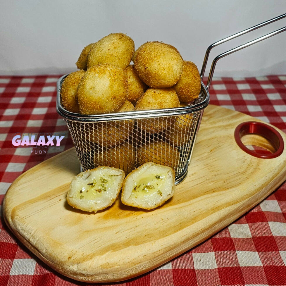 Recheado com queijo mozarela com orégano. Massa sabor queijo. Sem ovos, contém lactose.