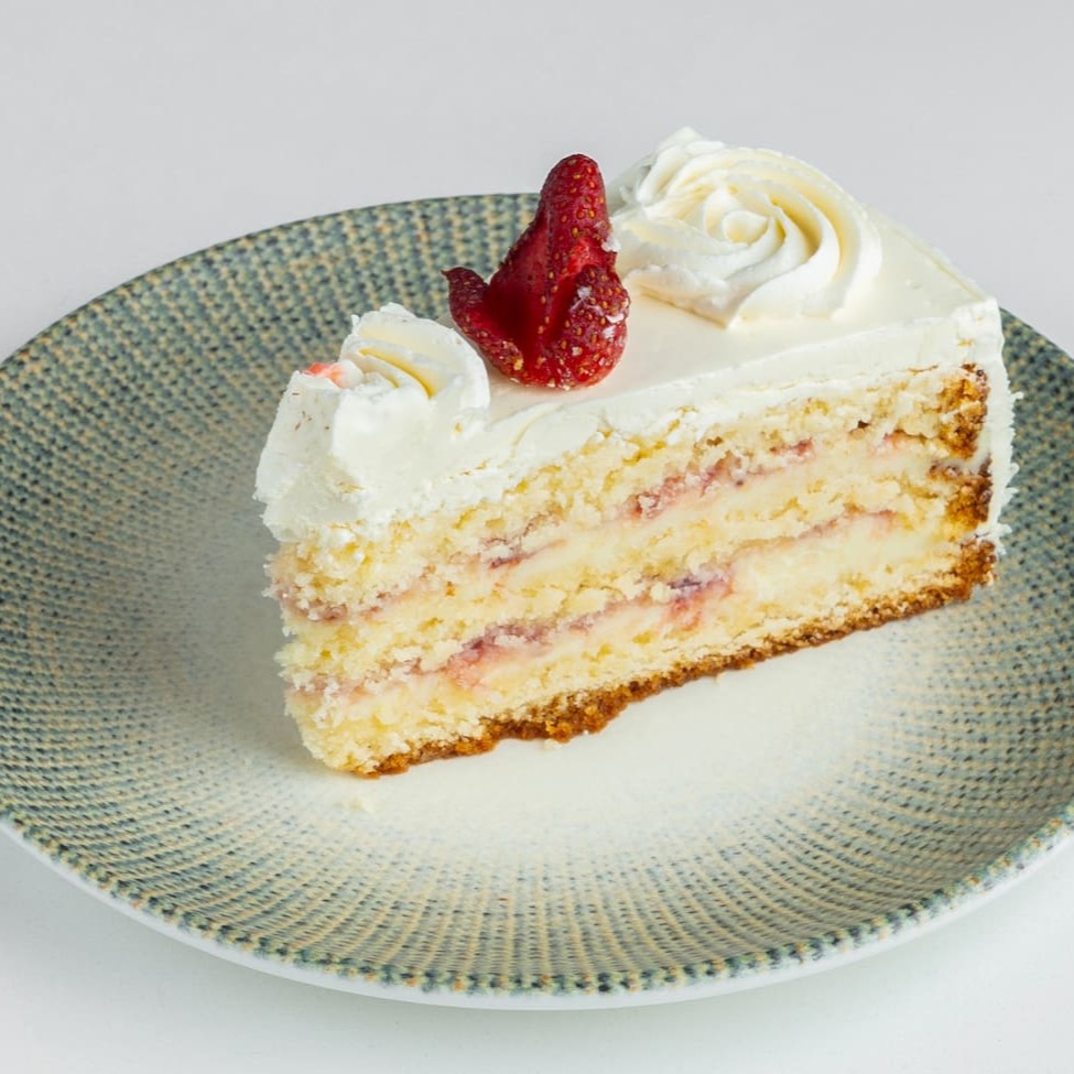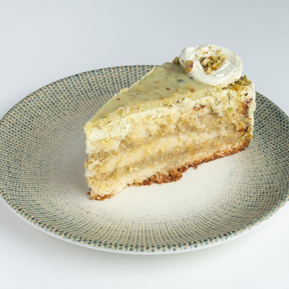 Fatia de bolo com massa de baunilha, recheado com brigadeiro de pistache e coberto por ganache de pistache e pistaches picados!