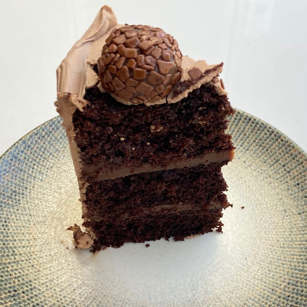 Fatia de bolo com massa de chocolate recheio de brigadeiro belga e coberto por buttercream.