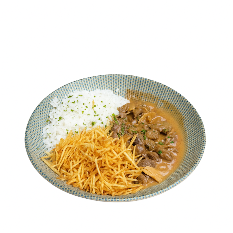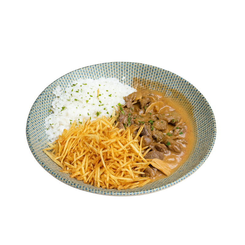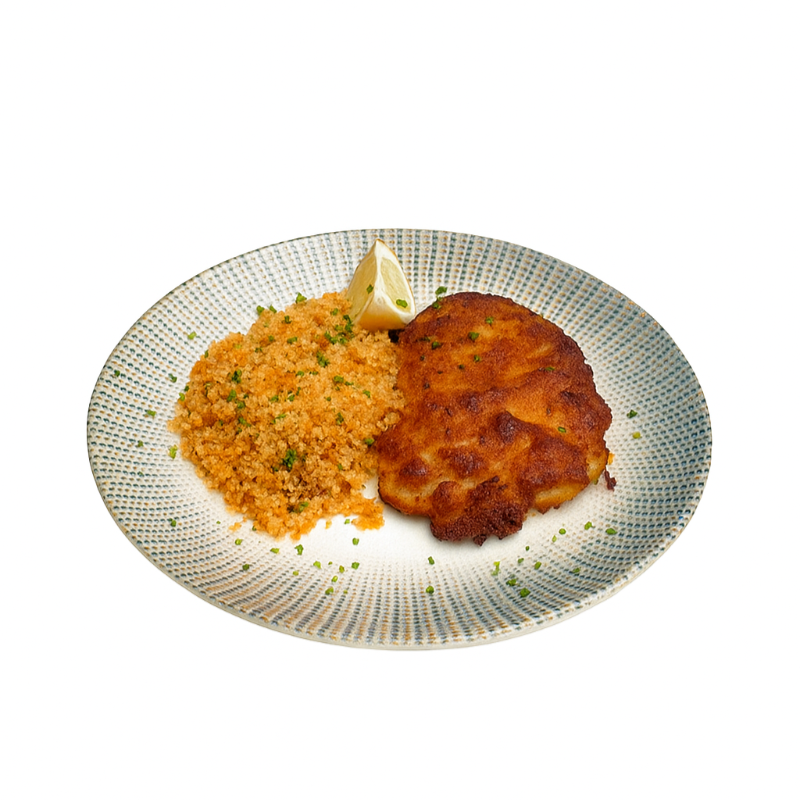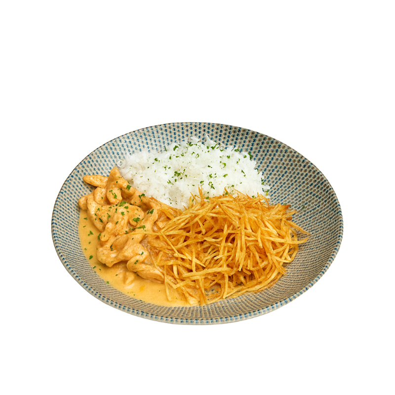 Massa leve de batata recheada com frango temperado, empanada e frita.