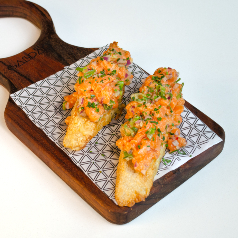 Massa de ovos, manteiga e gemas, recheada de camarão e assada.