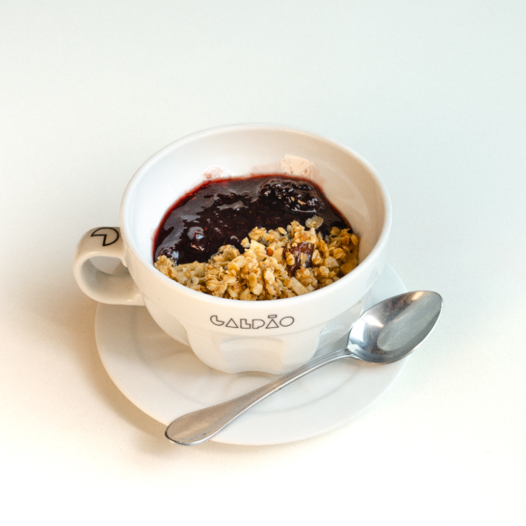 Iogurte natural, geleia de frutas vermelhas e granola da casa.