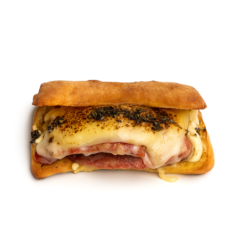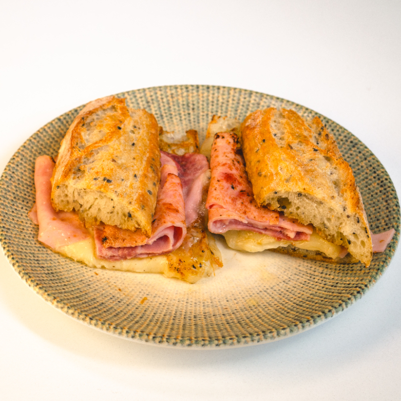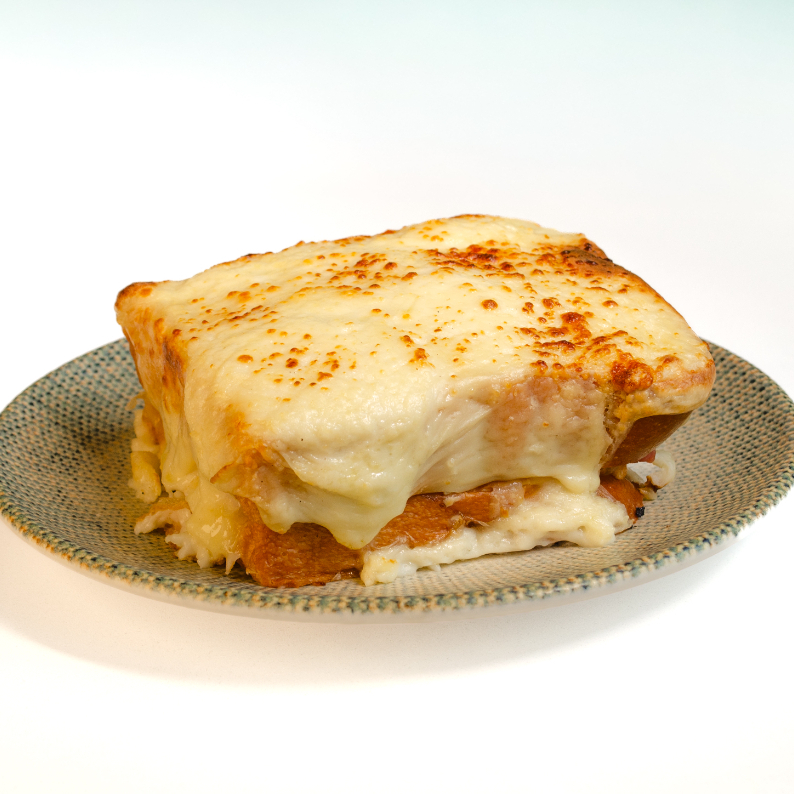 Pão de forma levemente tostado, recheado com presunto e queijo , e depois coberto com um generoso toque de molho béchamel antes de ser gratinado até ficar dourado e borbulhante.