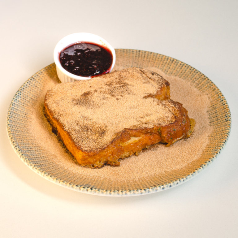 Fatia de brioche passado no leite com açucar e frito. Finalizado com açucar e servido com geleia artesanal de frutas vermelhas.