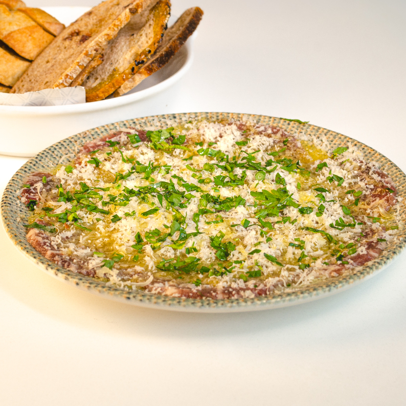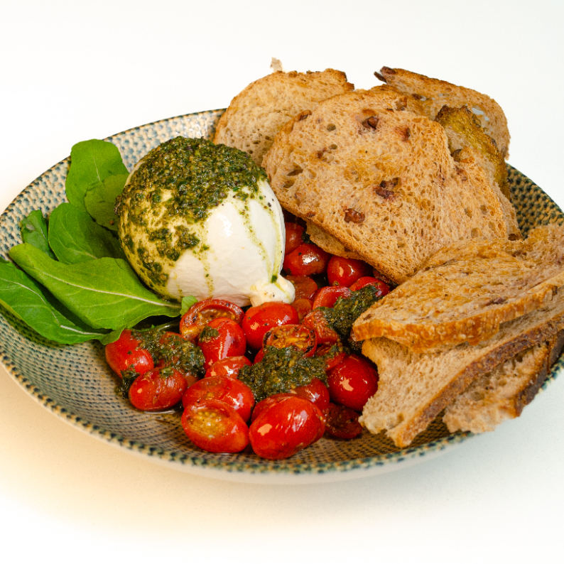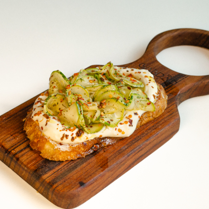 Pão Italiano de fermentação natural tostado, abobrinha grelhada no azeite, queijo cremoso e um toque de ervas frescas.