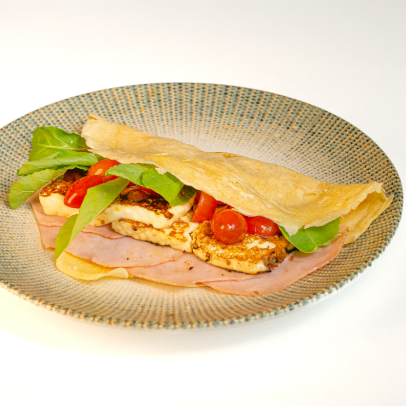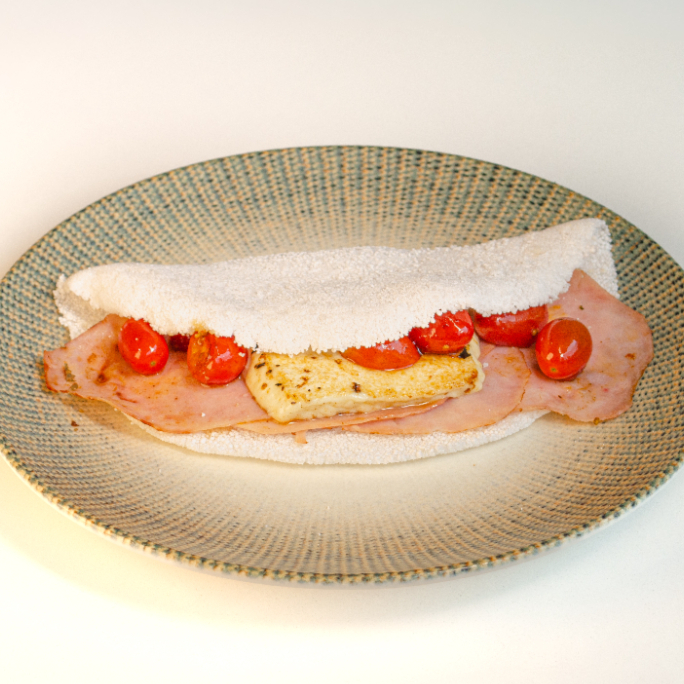 Farinha de Tapioca, queijo minas, peito de perú e finas fatias de tomate.