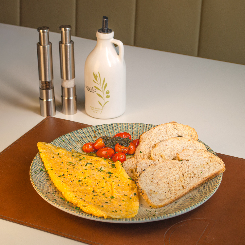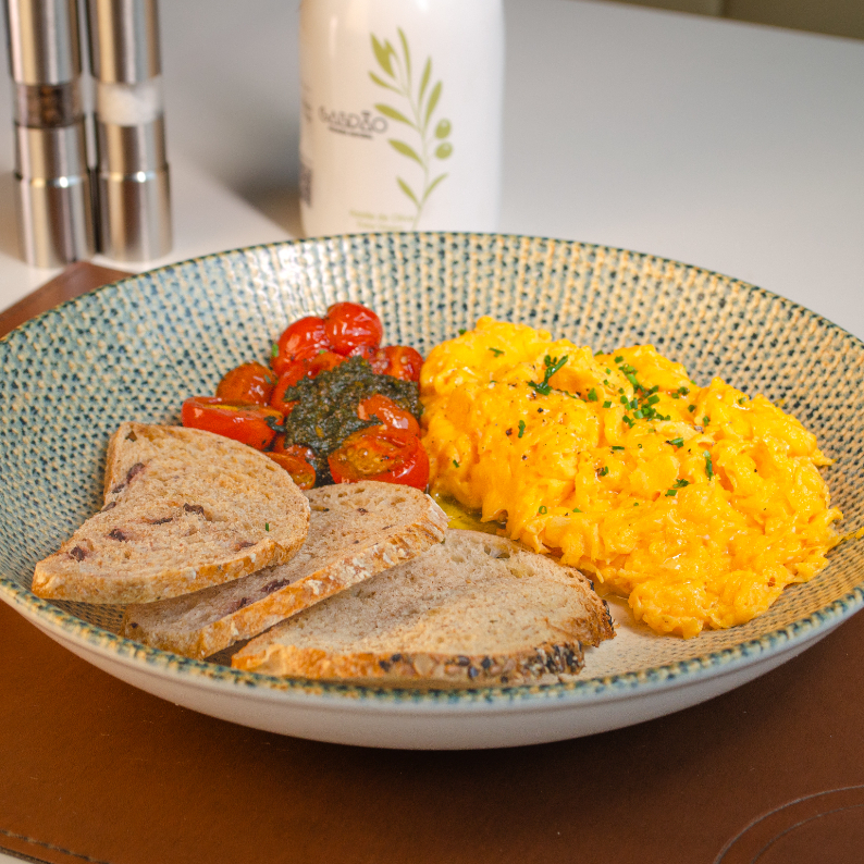 Fritada de 3 ovos batidos com manteiga e tomate confit. Acompanha torradinhas.